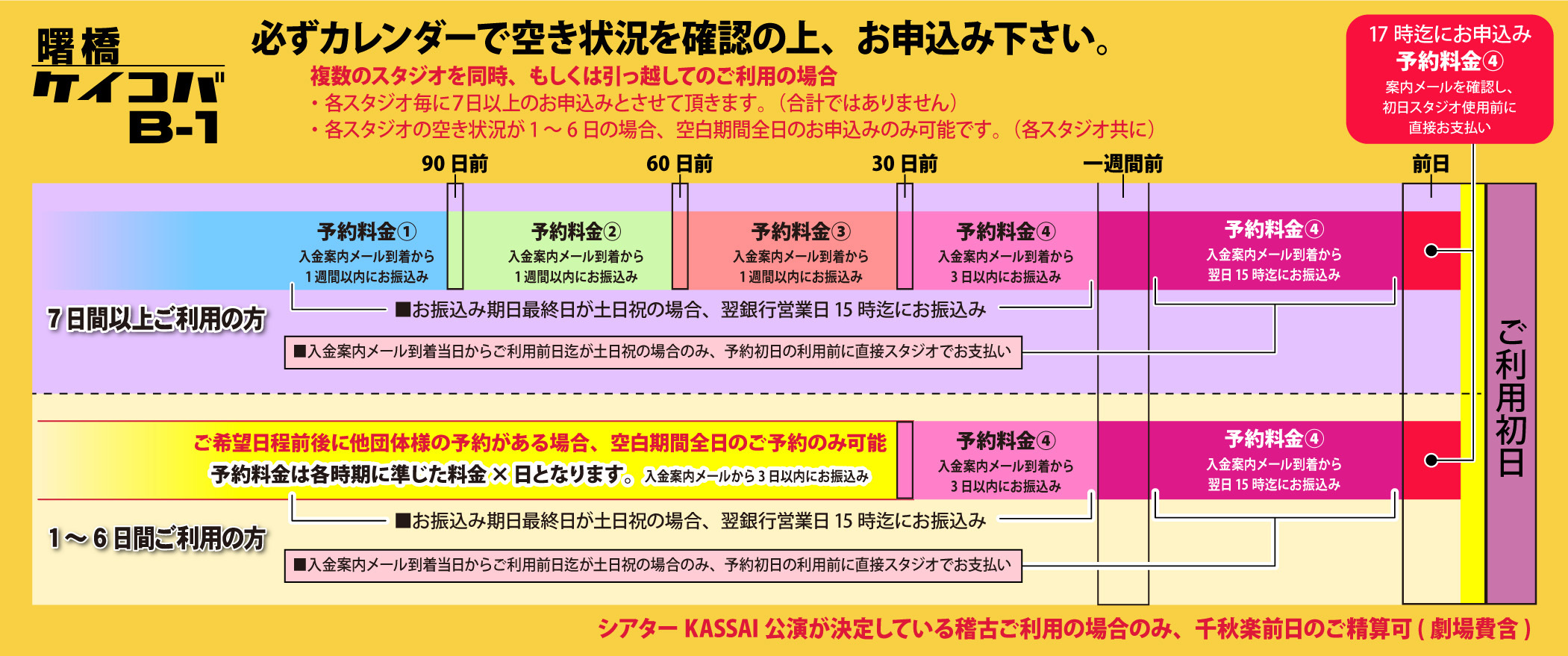 別スタジオの場合は、通常のお申込みとなります。一週間以上か、空白期間全日、もしくはご利用一ヶ月前からのお申込みとなります。