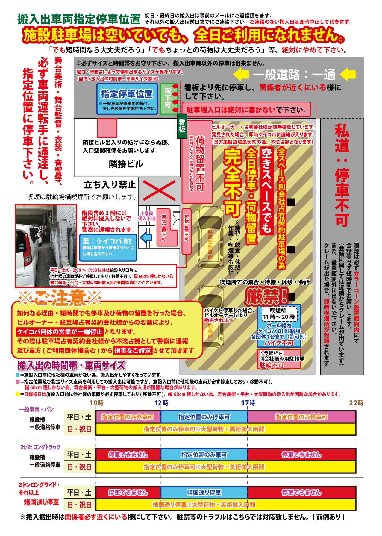 ※上記2点お守り頂けない場合、ビルオーナー・占有駐車場確保会社様からの要請により、短時間/理由の如何を問わず、ケイコバ自体の営業が一端停止となります。その際は損害請求をさせて頂きます(ご利用団体様の別稽古場確保代等含む)。