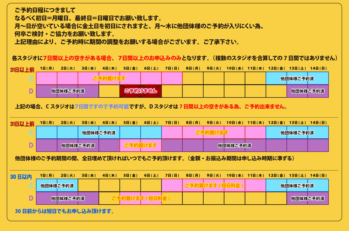 2つのスタジオをご利用の場合、各スタジオ毎に7日間以上のご予約をお願い致します。